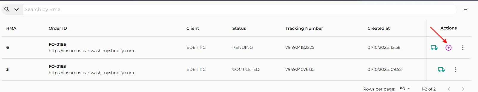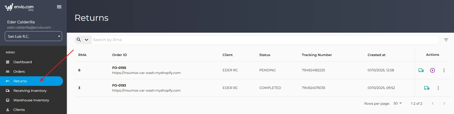 Esta acción te llevará a la página principal de “Returns“, donde verás una lista de todas las órdenes de devolución existentes.