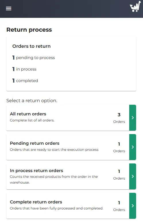 - Órdenes de devolución en proceso (In process return orders): Cuenta los productos recibidos del pedido en el almacén. Estas órdenes están activas y requieren seguimiento hasta su finalización.