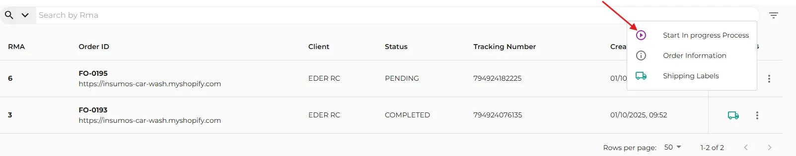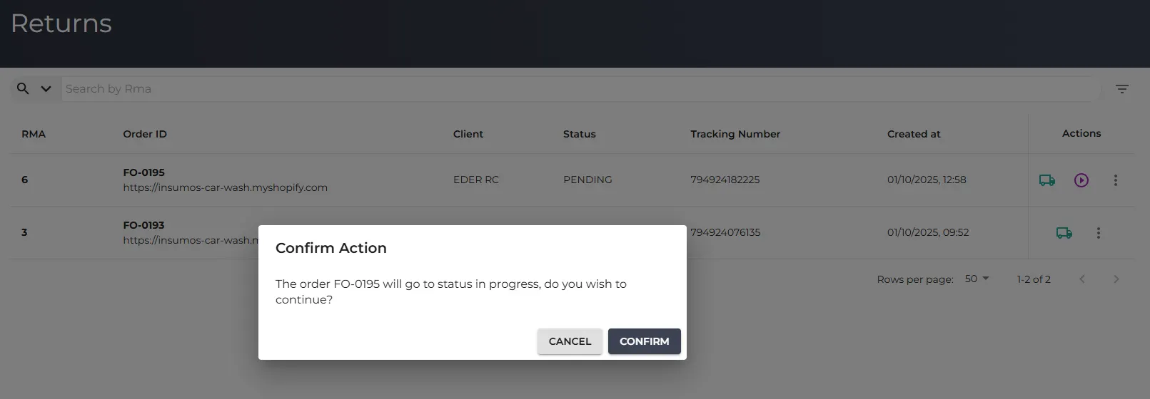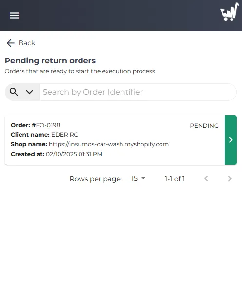 - Órdenes de devolución pendientes (Pending return orders): Órdenes que están listas para iniciar el proceso de ejecución. Estas son las solicitudes recién enviadas por el cliente que requieren una primera acción.