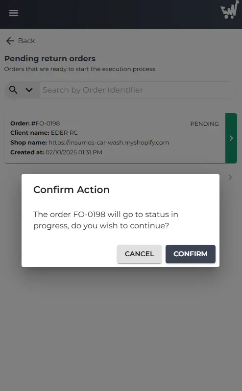 - Verificar la Orden En la parte superior, se muestra el Identificador de la orden (Order: #FO-0198) para confirmar que estás trabajando con la devolución correcta.