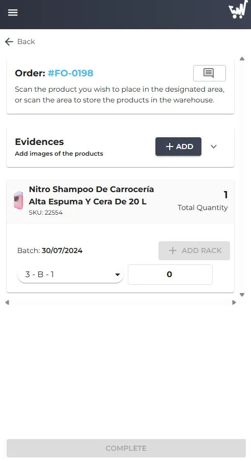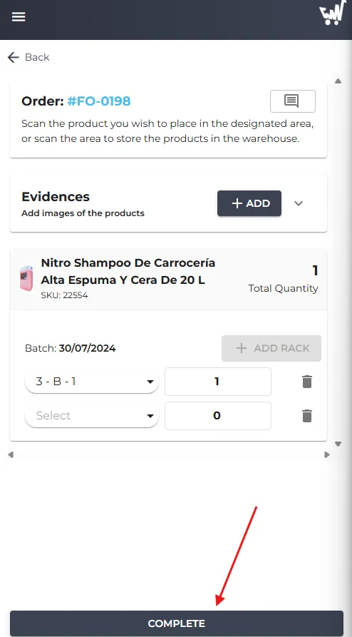 - Una vez que hayas verificado todos los productos, añadido las evidencias necesarias y asignado cada artículo a su ubicación de rack correspondiente con su cantidad exacta, haz clic en el botón “COMPLETE” en la parte inferior de la pantalla.