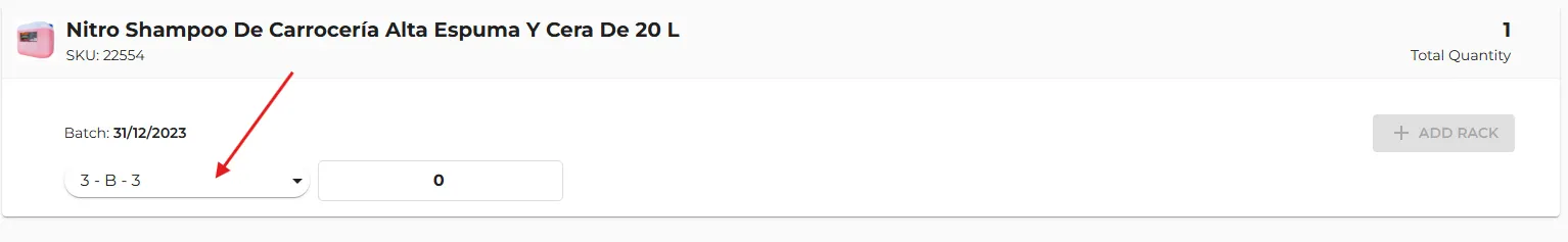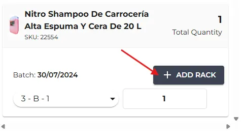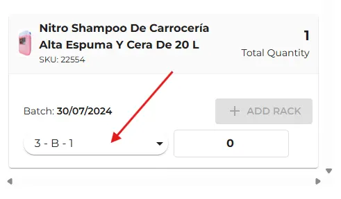 - Selección del rack o racks: Selecciona dónde se van a colocar los productos. Por defecto se preselecciona la ubicación de la cual fue tomado el producto
