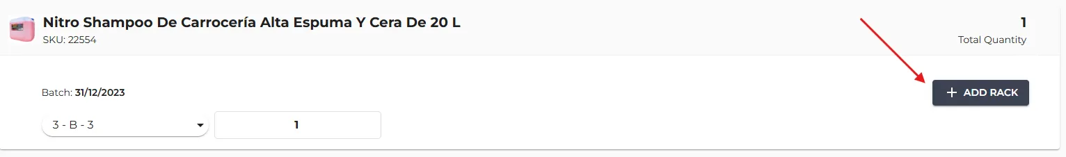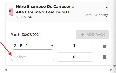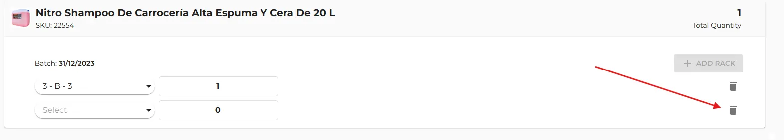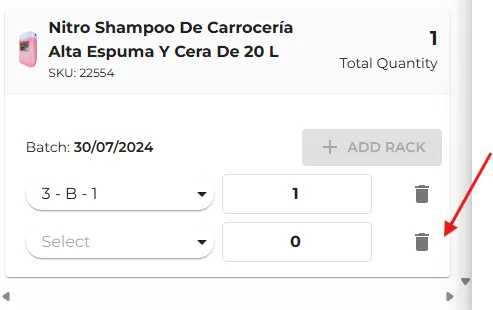- Eliminar una ubicación Si accidentalmente añades una ubicación de rack incorrecta o ya no necesitas una de las asignaciones, puedes eliminarla. Para cada línea de asignación de rack y cantidad, encontrarás un icono de papelera (un cubo de basura) en el extremo derecho. Haz clic en este icono para eliminar esa fila de asignación de rack específica.