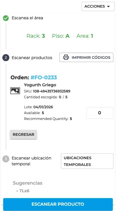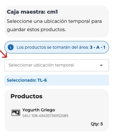 Within the modal, you must indicate in which Temporary Location (TL) the products will be deposited. You have two ways to do it: