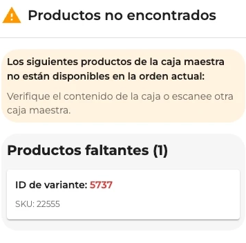 Products not found in the area If any product in the Master Carton is not assigned to the current area, a warning modal will appear with the list of missing products. In this case: