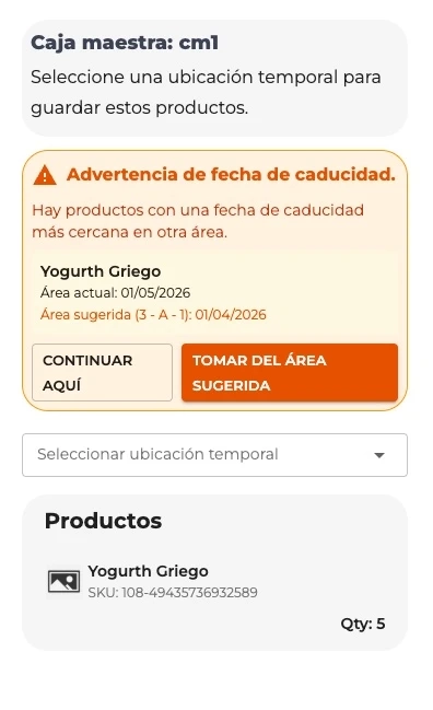 Expiration date warning If there are products with a closer expiration date in another area of the warehouse, you will see an orange banner inside the modal with two options: