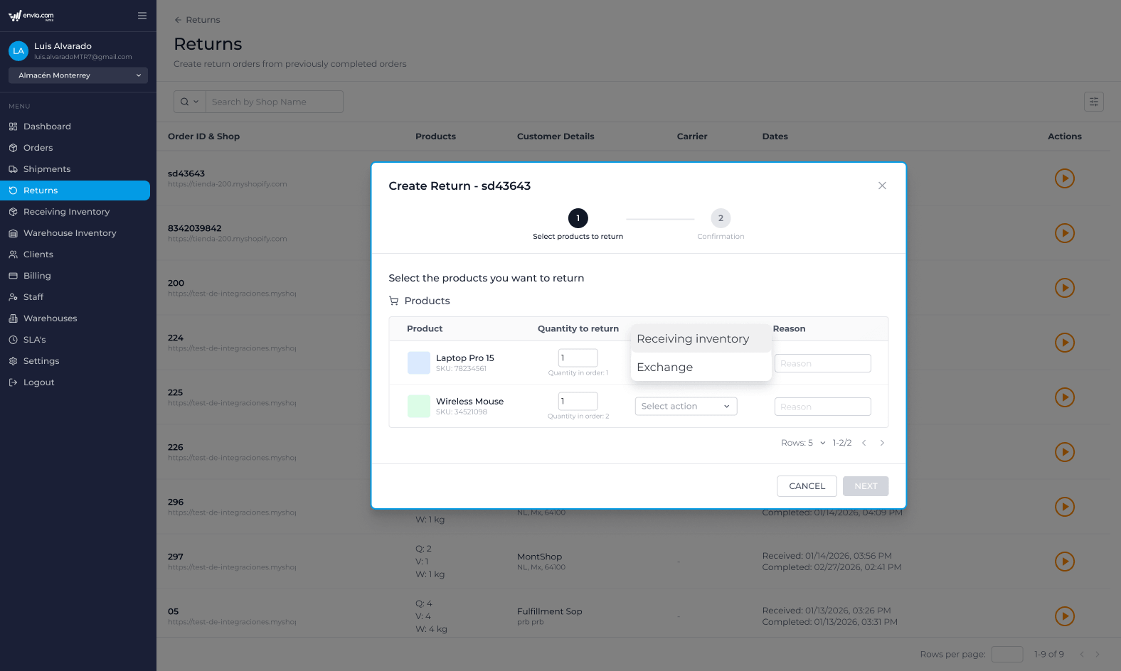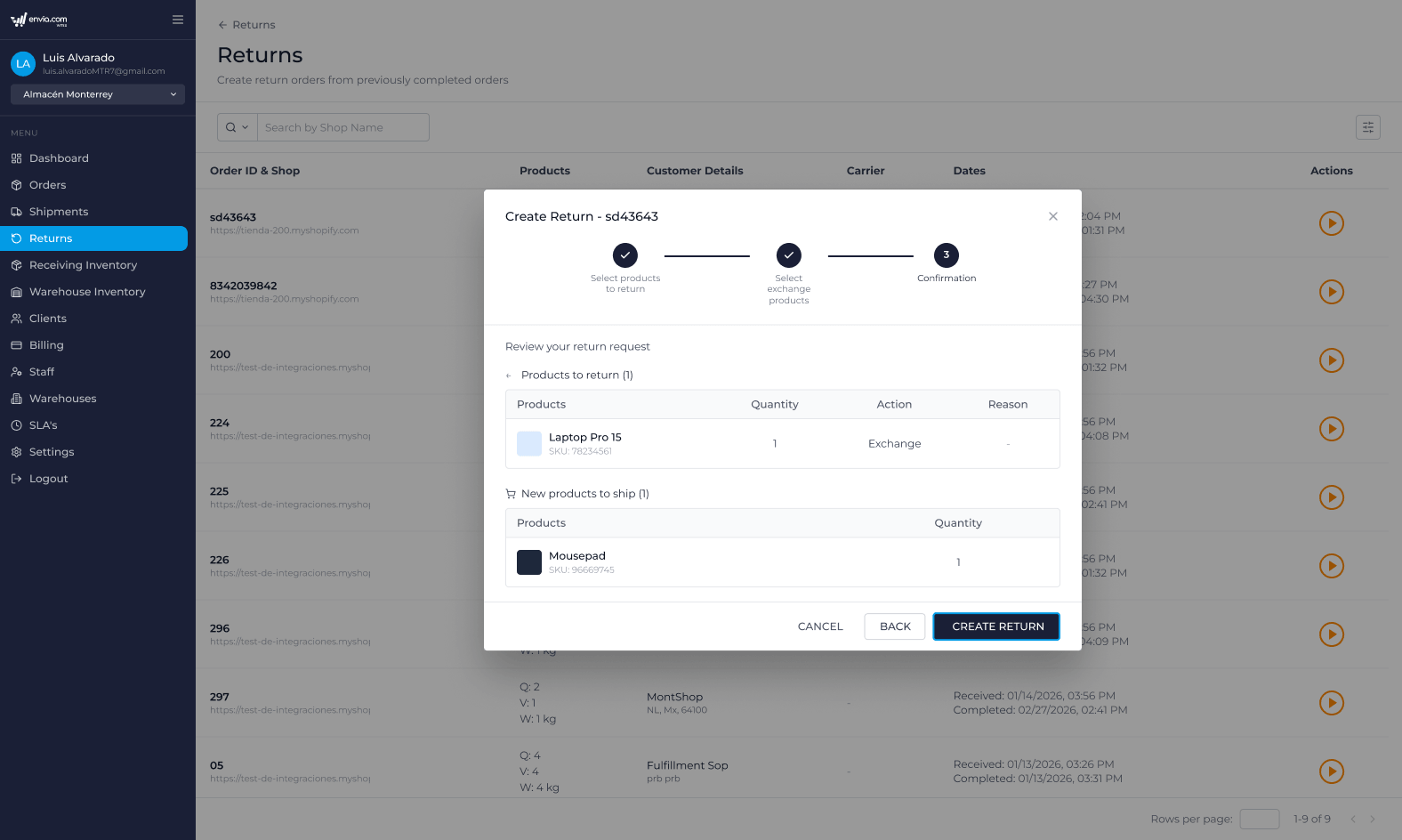 ℹ️ Before confirming the return, please carefully review the quantities selected and the action applied to each product to avoid errors in inventory or replacement shipments.